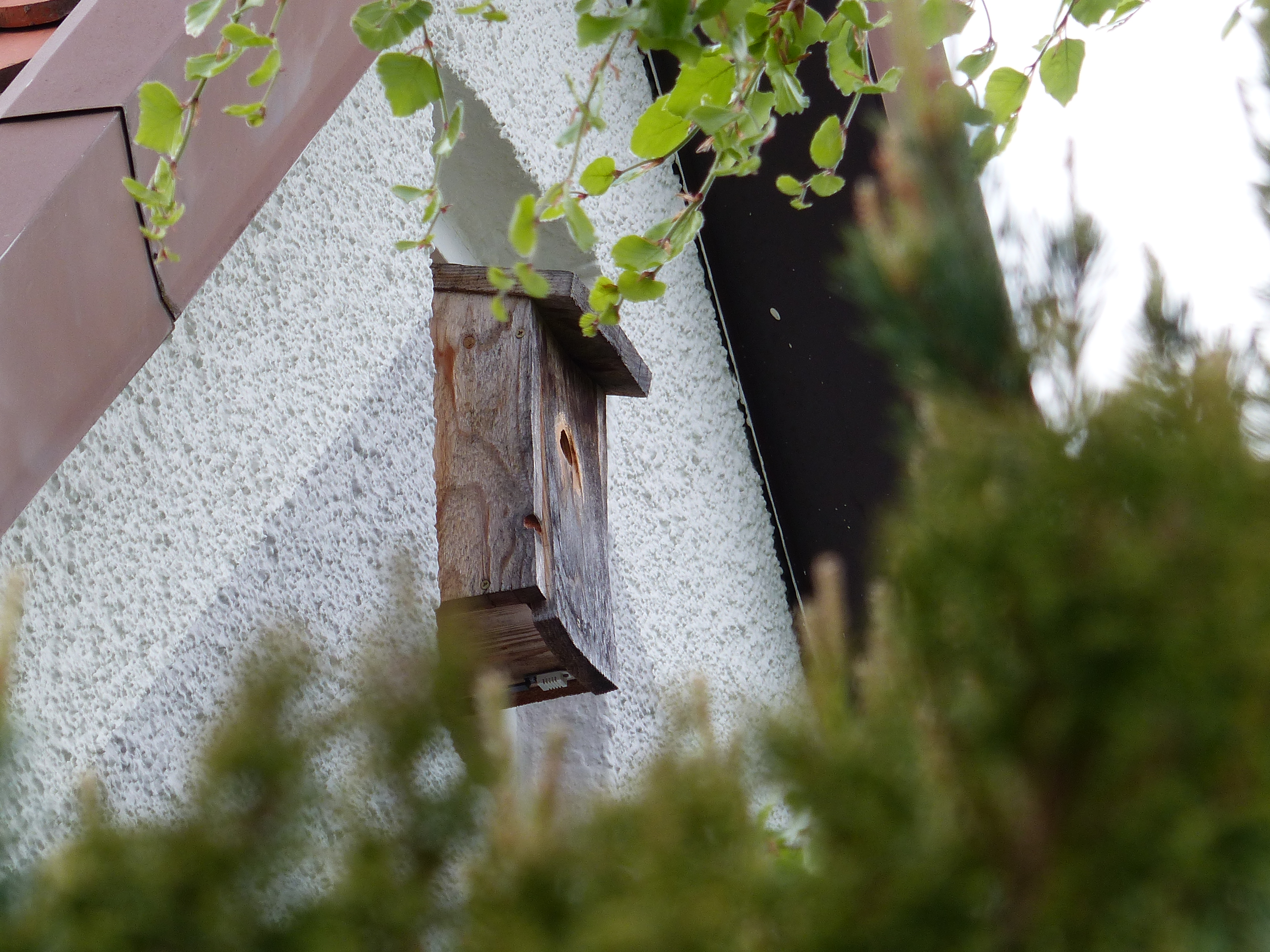 Schon vor einigen Jahren habe ich einen Nistkasten an unserem Dachgiebel gebaut. Gleich im ersten Jahr haben Blaumeisen darin ihr Nest gebaut.
